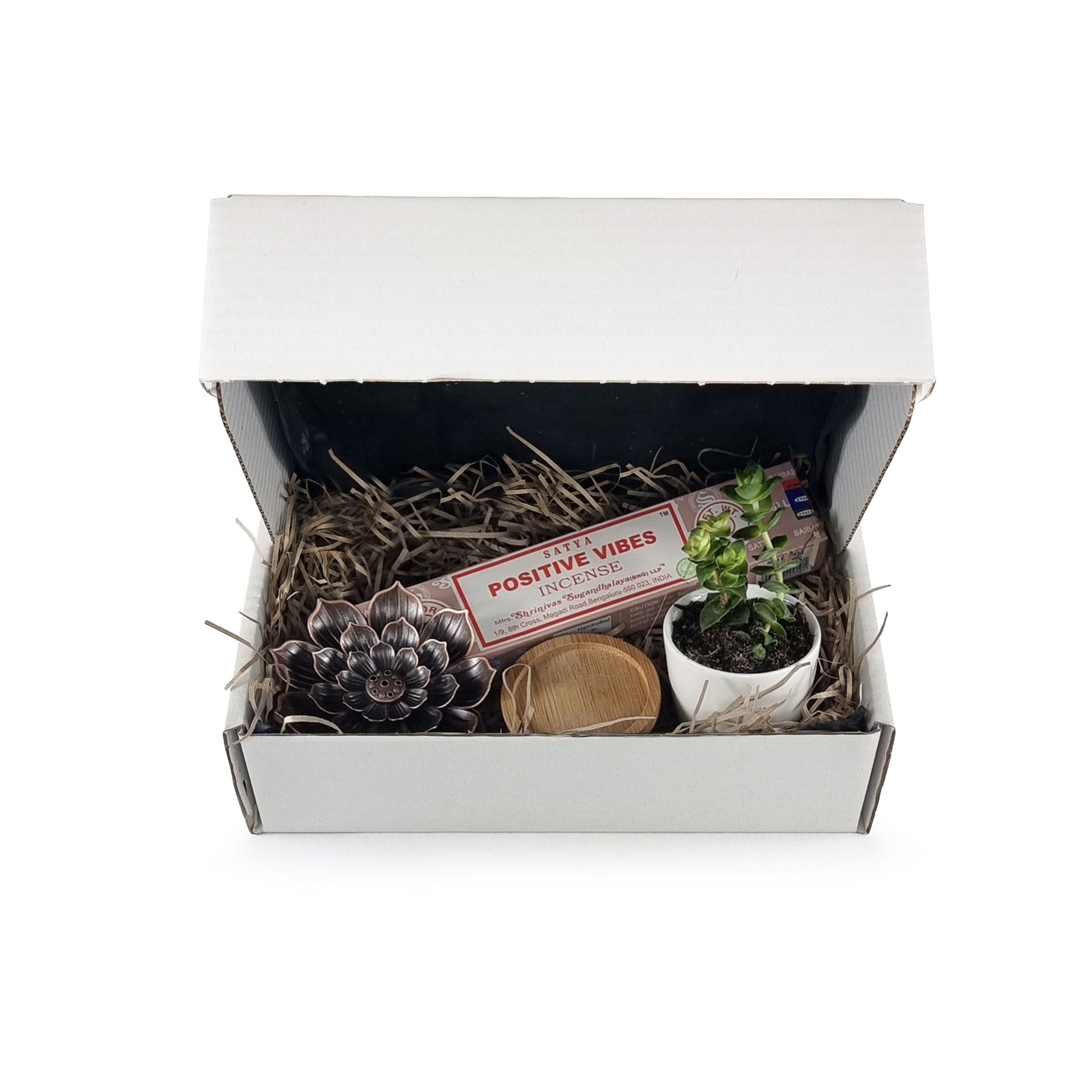 Care package with incense and lotus flower holder with plant, pot and drip tray