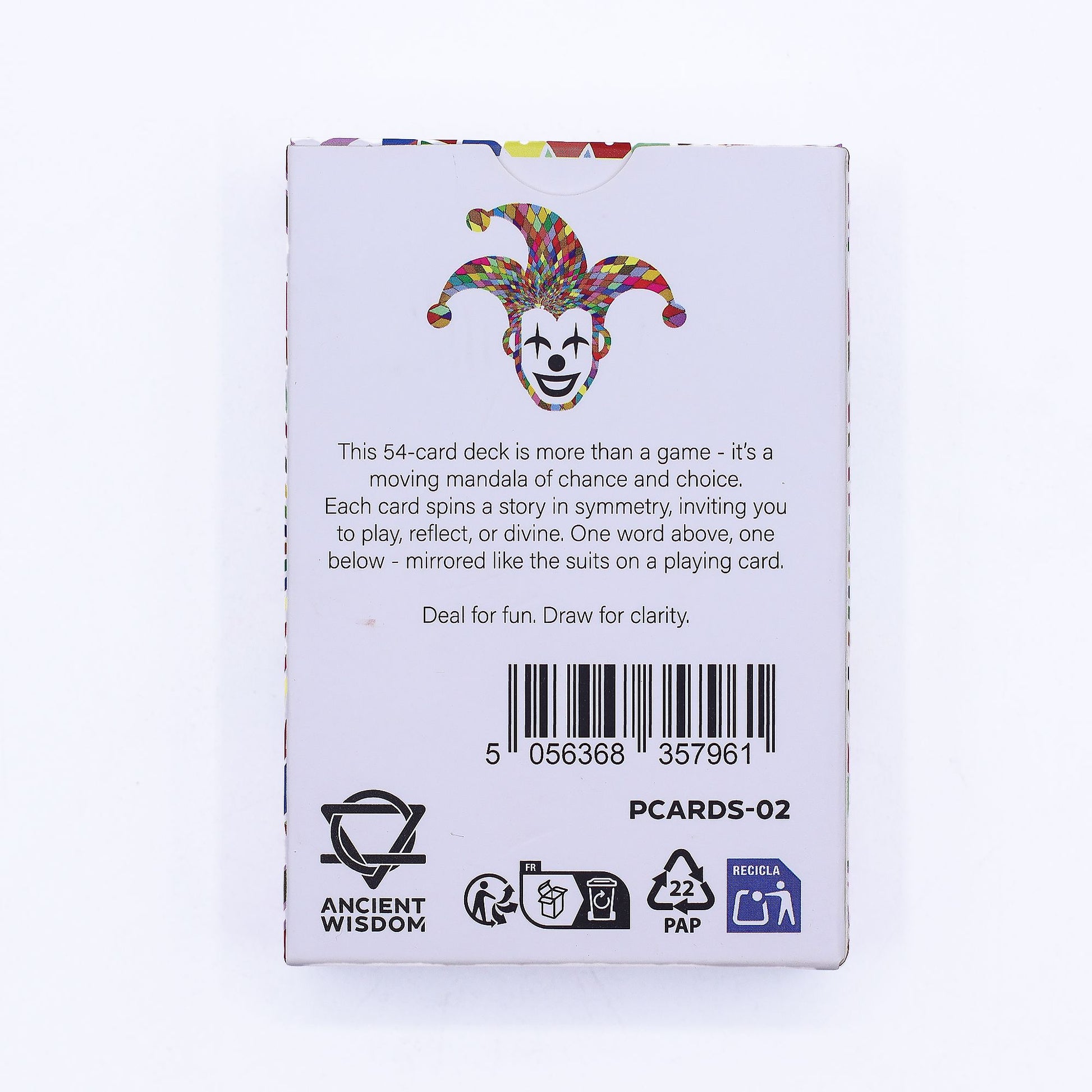 This luminous 54-card deck brings colour, clarity, and quiet reflection to your table. Use it for classic card games or as an oracle for mindful insight — each mandala carries the symmetry of choice, the rhythm of balance, and the harmony between play and purpose.